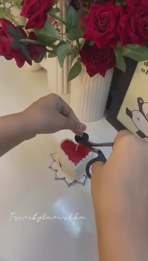The Red Heart Cake candle is a handmade masterpiece crafted with love, designed in a charming heart shape. This elegant candle adds a warm, intimate ambiance to any setting, making it perfect for romantic evenings or thoughtful gifts. Its refined design and subtle fragrance create a sophisticated touch to your decor while celebrating affection and care.